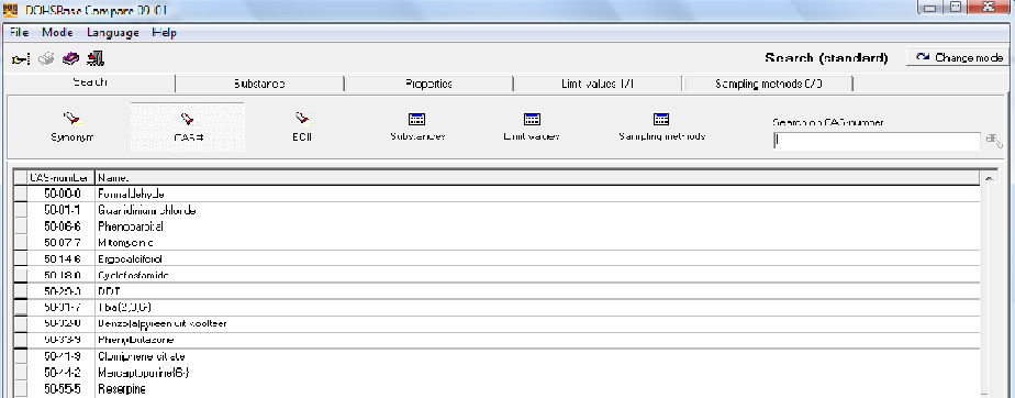 This is the main window of DOHSBase Compare. In this window you work with the program. In the figure you see the main window in the Search & Find Mode. On the far right there is the button (Change Mode) to switch between the Search & Find Mode and the Compare Mode. The Search & Find Mode is the default setting.