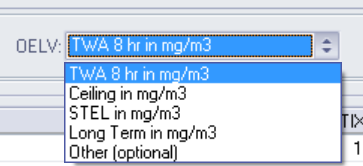 This pulldown menu gives 5 different options for the type of Occupational Exposure Limit Value which can be used to calculate the Threshold Exceedance IndeX (TIX), and therefore the appropriate Risk Assesment Score (RAS). The usual hierarchy of limit values (as in the Search & Find mode) is also used here.