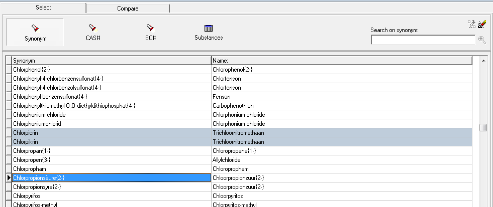 In the frame of this tab you see a list of substances, ordered in one the following search possibilities. Default is the list on base of names and synonyms. Switching between the search possiblities is possible by clicking on the desired button.