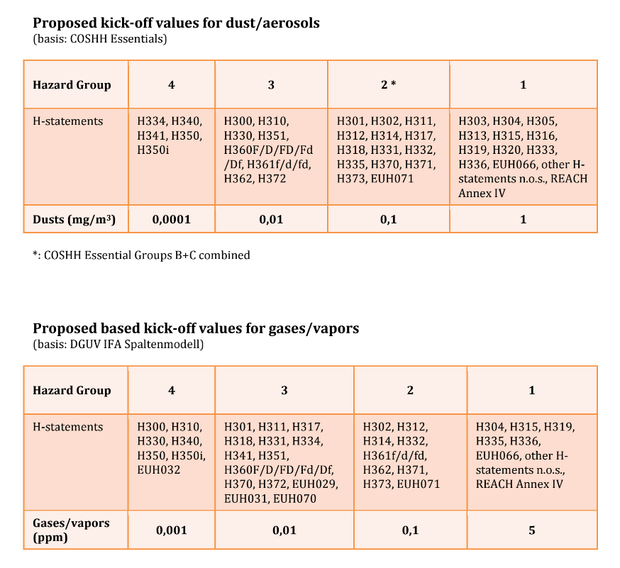 The following table lists the H-statements associated with each Hazard Class. The table also contains the derived Kick-off level for each Hazard Class. The Kick-off levels for dusts are presented in mg/m3 (a substance gets a kick-off value from the H-statement in the highest Hazard Class). The Kick-off level for gases and vapours are in parts per million (ppm). To convert these to mg/m3 the molecular mass has to be used.