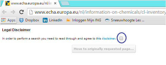NOTE: It is possible that the hyperlink does not directly produce the desired result, but you land on a page with a disclaimer from ECHA. Check the box next to "disclaimer (blue outlines in the image below) and change the URL with function key F5. Then the webpage with the classification and labeling information of the substance appears.