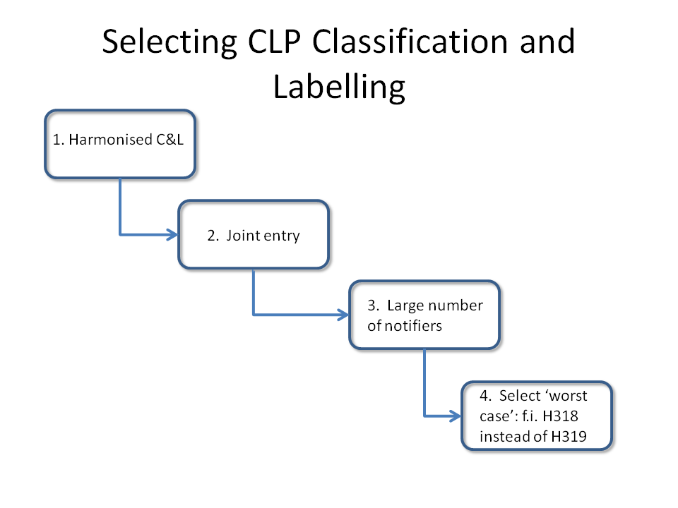 The button "Check the ECHA C&L Notification" activates a hyperlink directly to the C&L Inventory of ECHA. The current notified (and if present also harmonized) classification and labeling is given for the substance. Usually several notified classifications are shown. The user can then make the selection with, for example, the above-mentioned scheme.