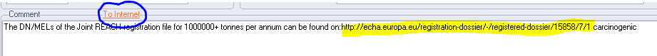 In the framework of this box a hyperlink 'to Internet' can be presented. It relates to hyperlinks to the database "Registered Substances" on the website of ECHA and to de Dutch SER-database on Limit Values. The hyperlinks are also available as text in the box Comments.