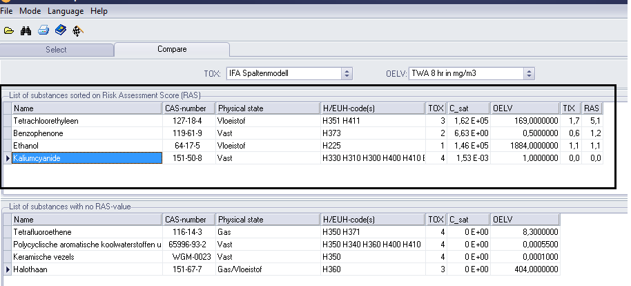 The substances for which no RAS-score can be calculated in the Compare Mode are presented in de lower table on this tab: Substances List with no RAS-score.
